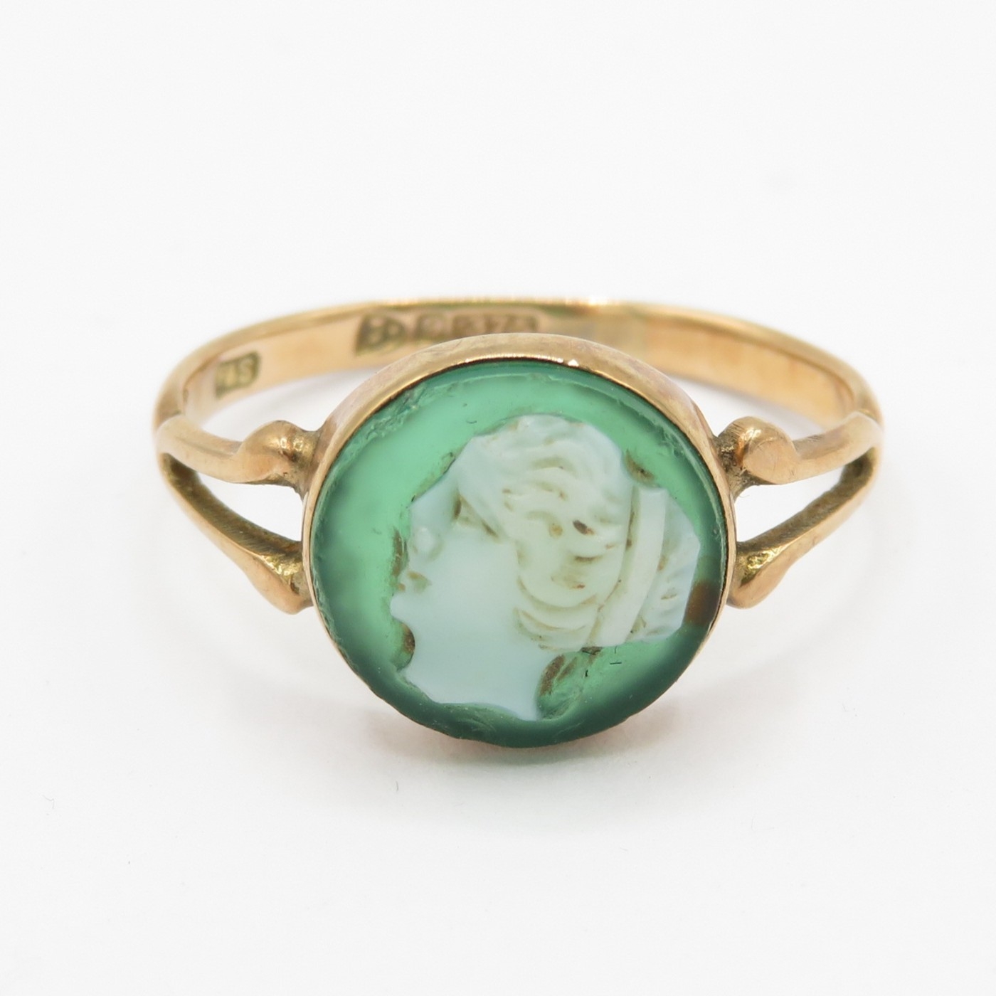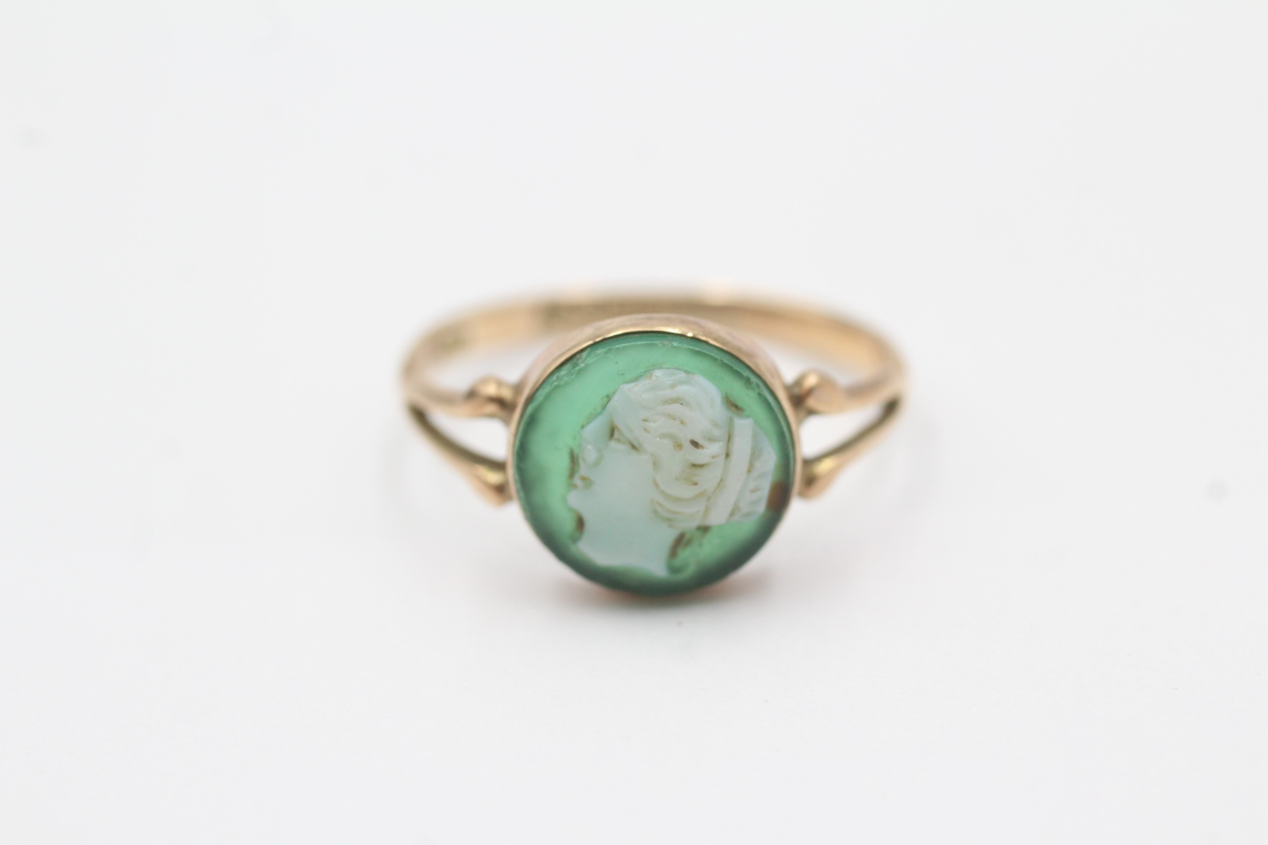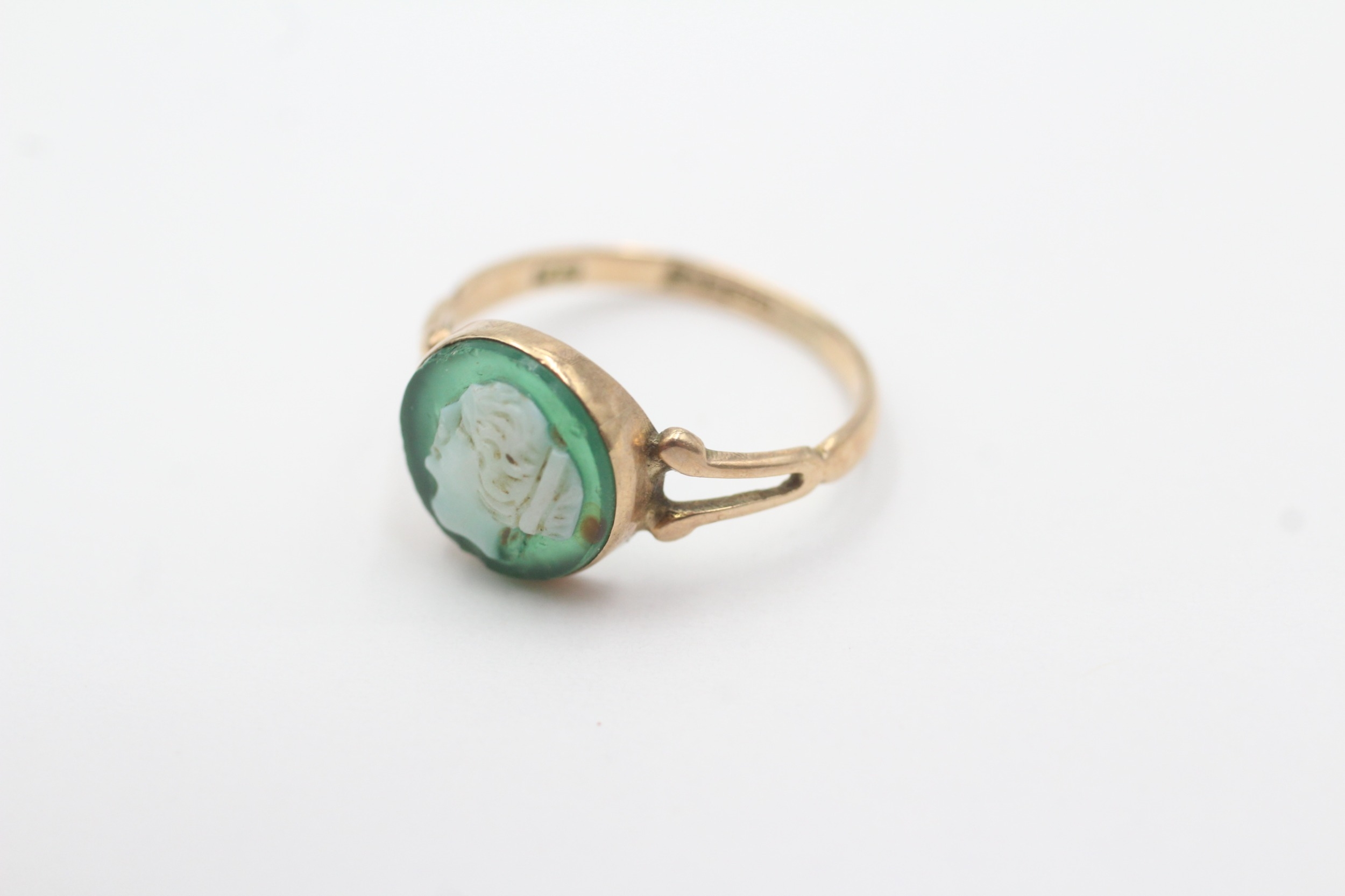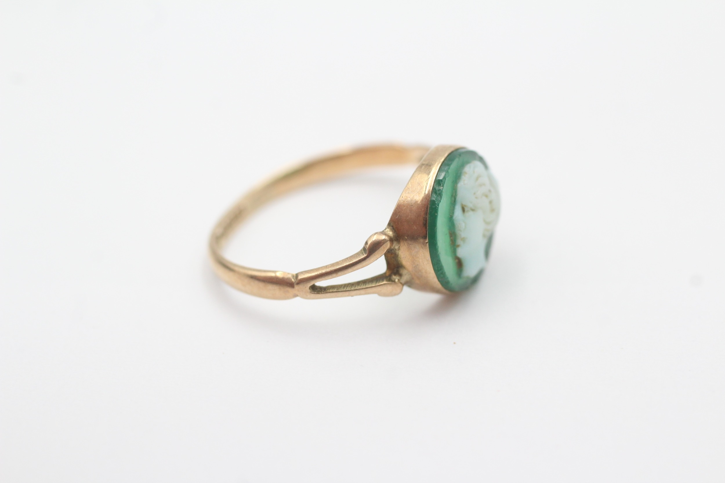 9ct gold green agate cameo ring (1.6g) Size M