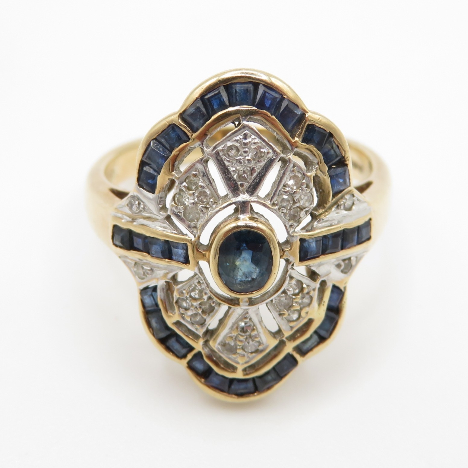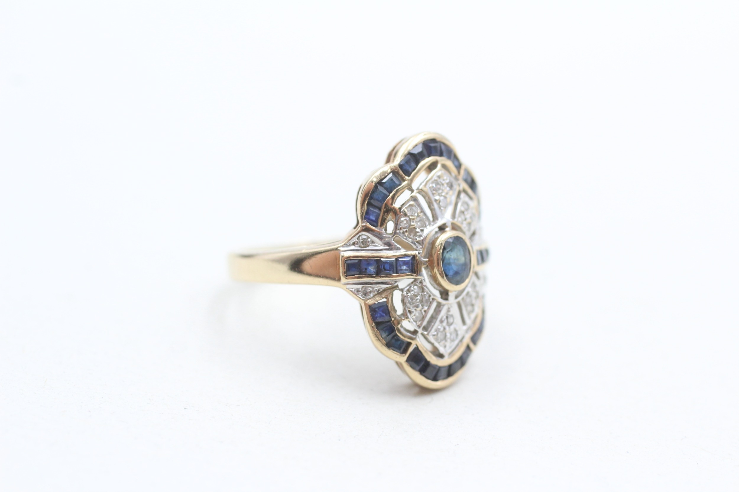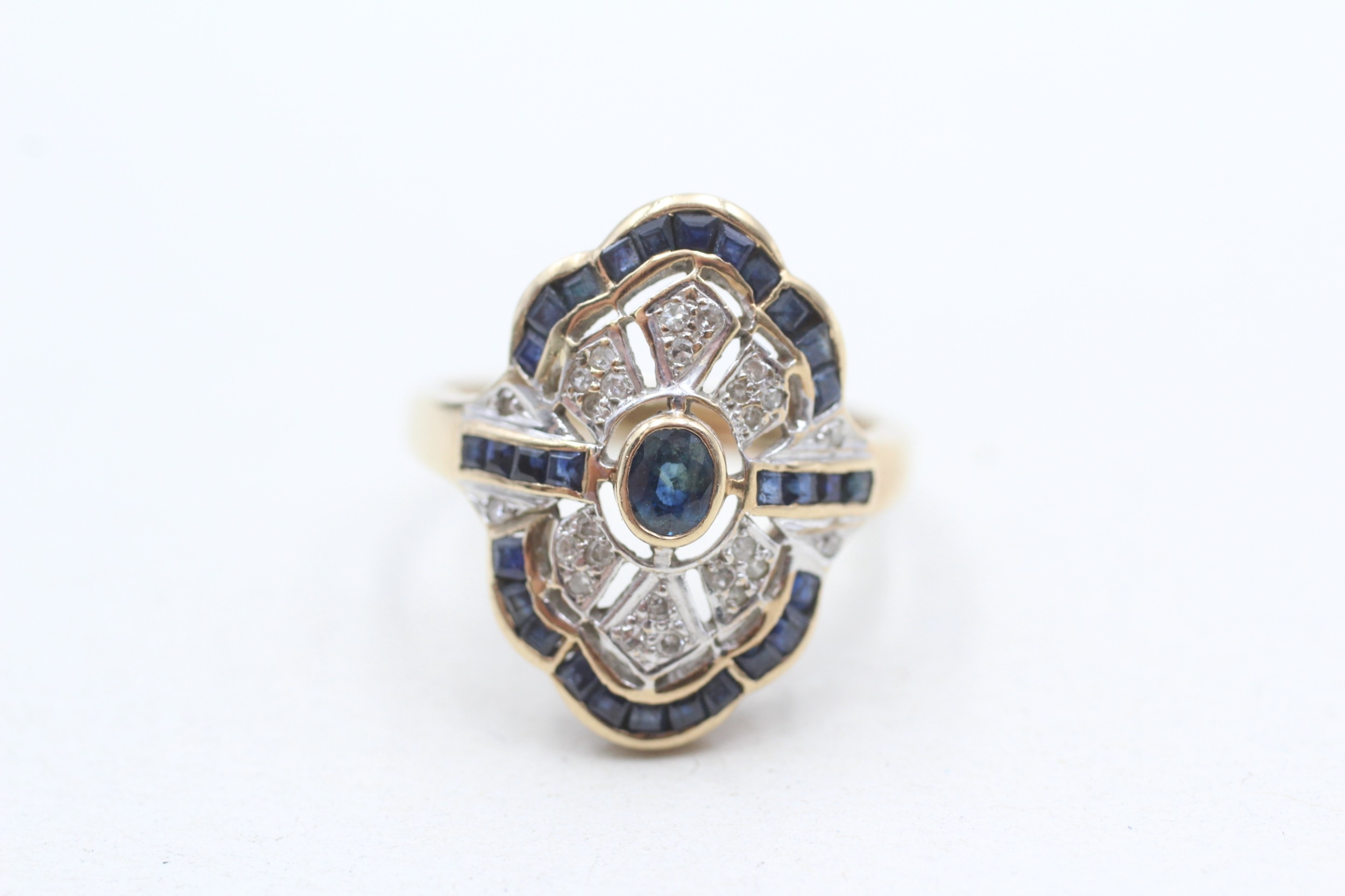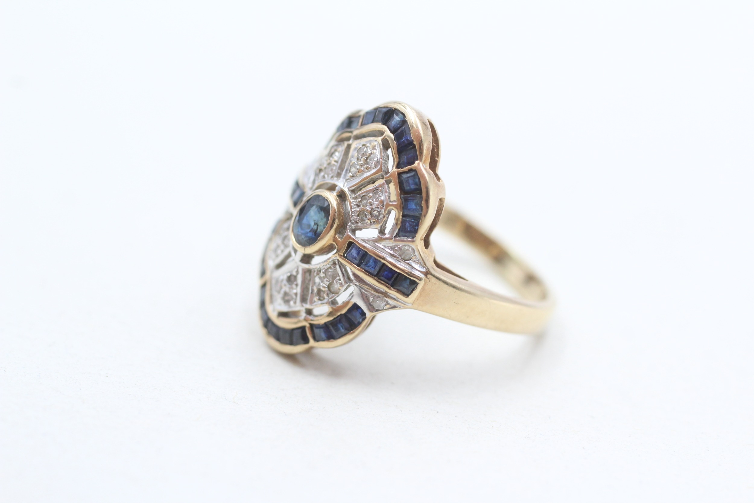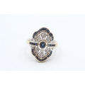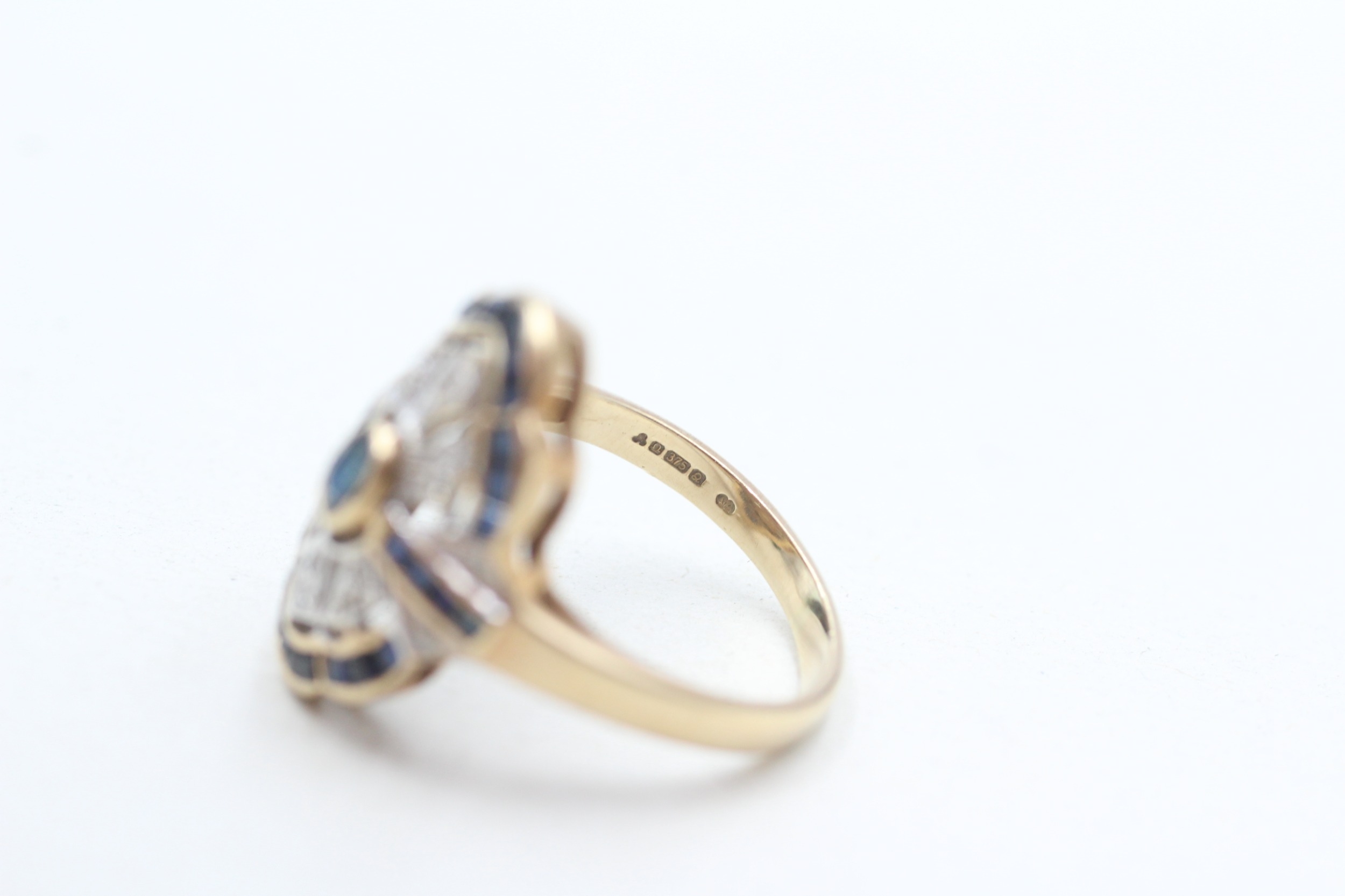 9ct gold diamond and sapphire set cocktail ring (3.7g) Size N