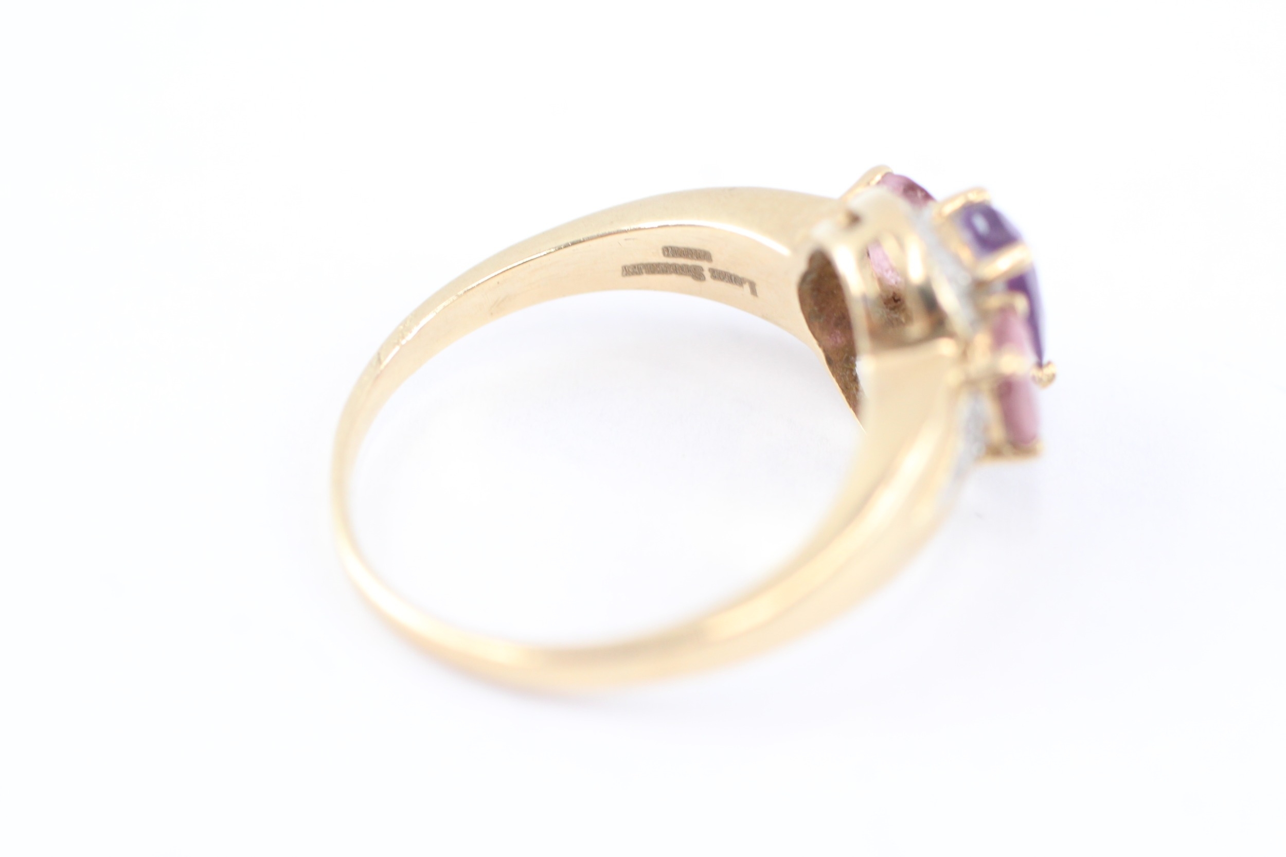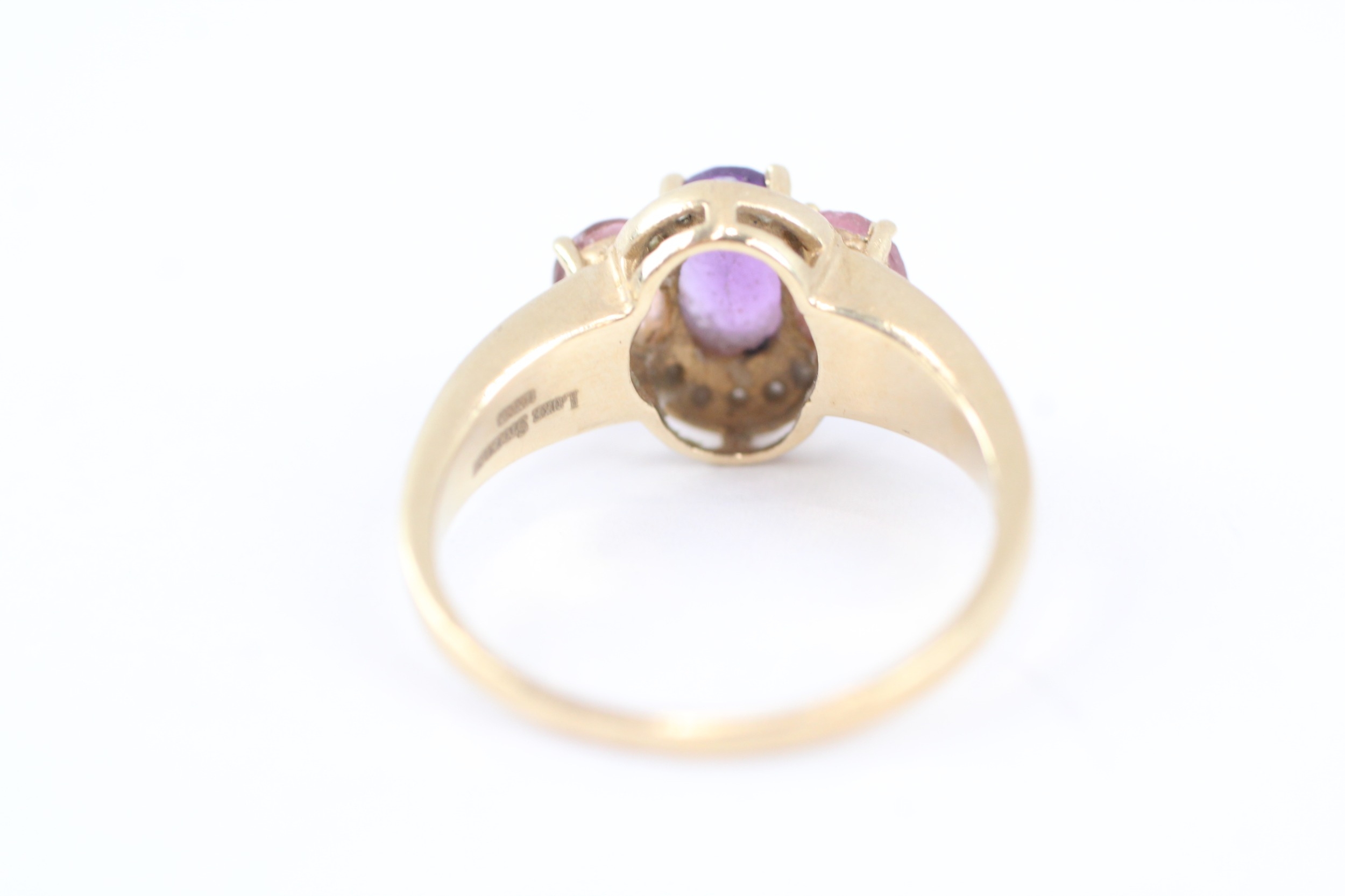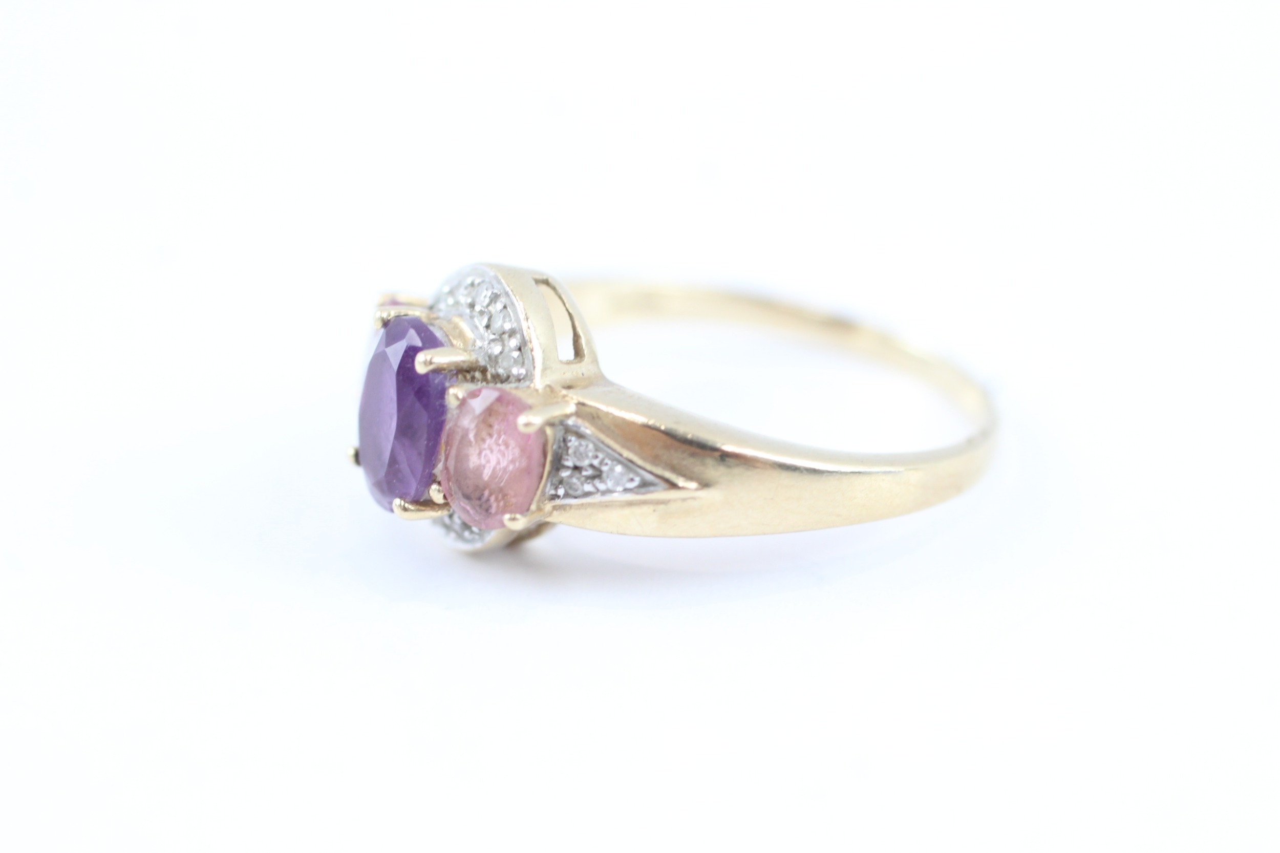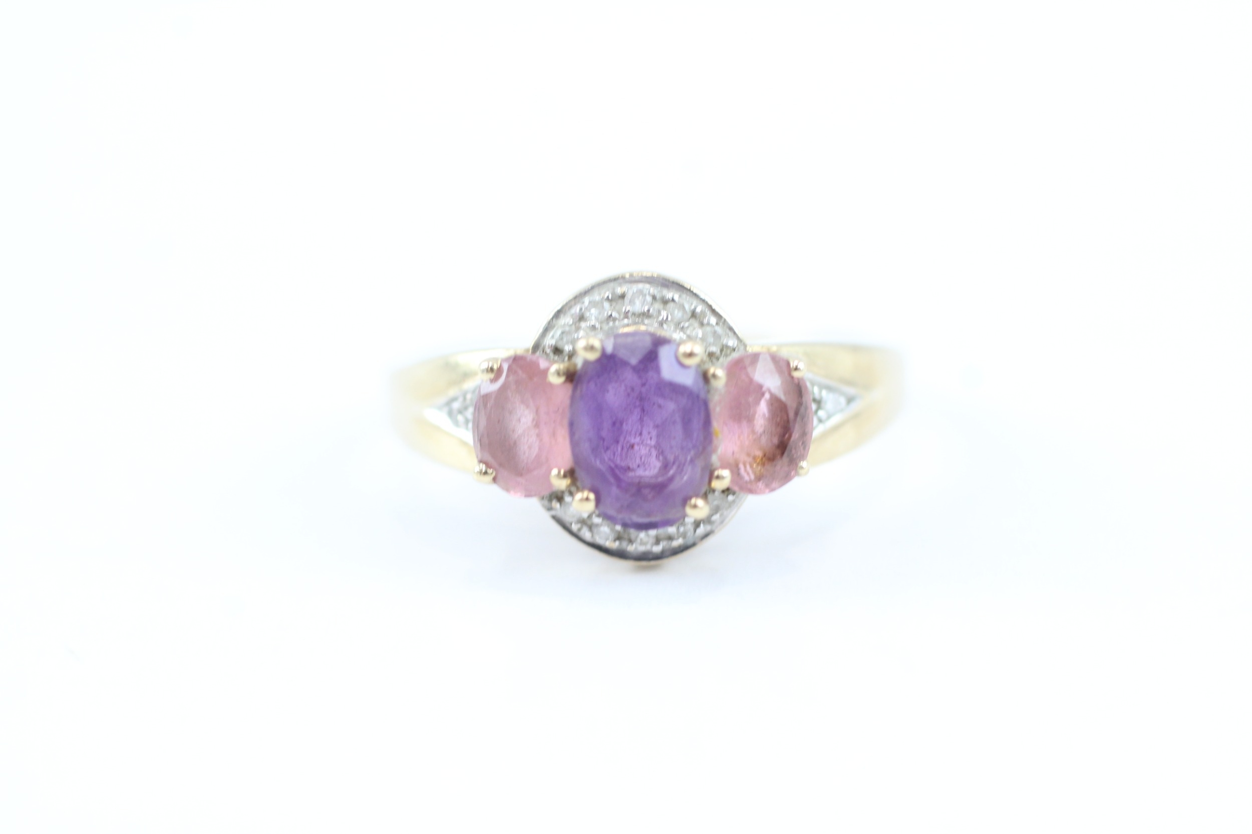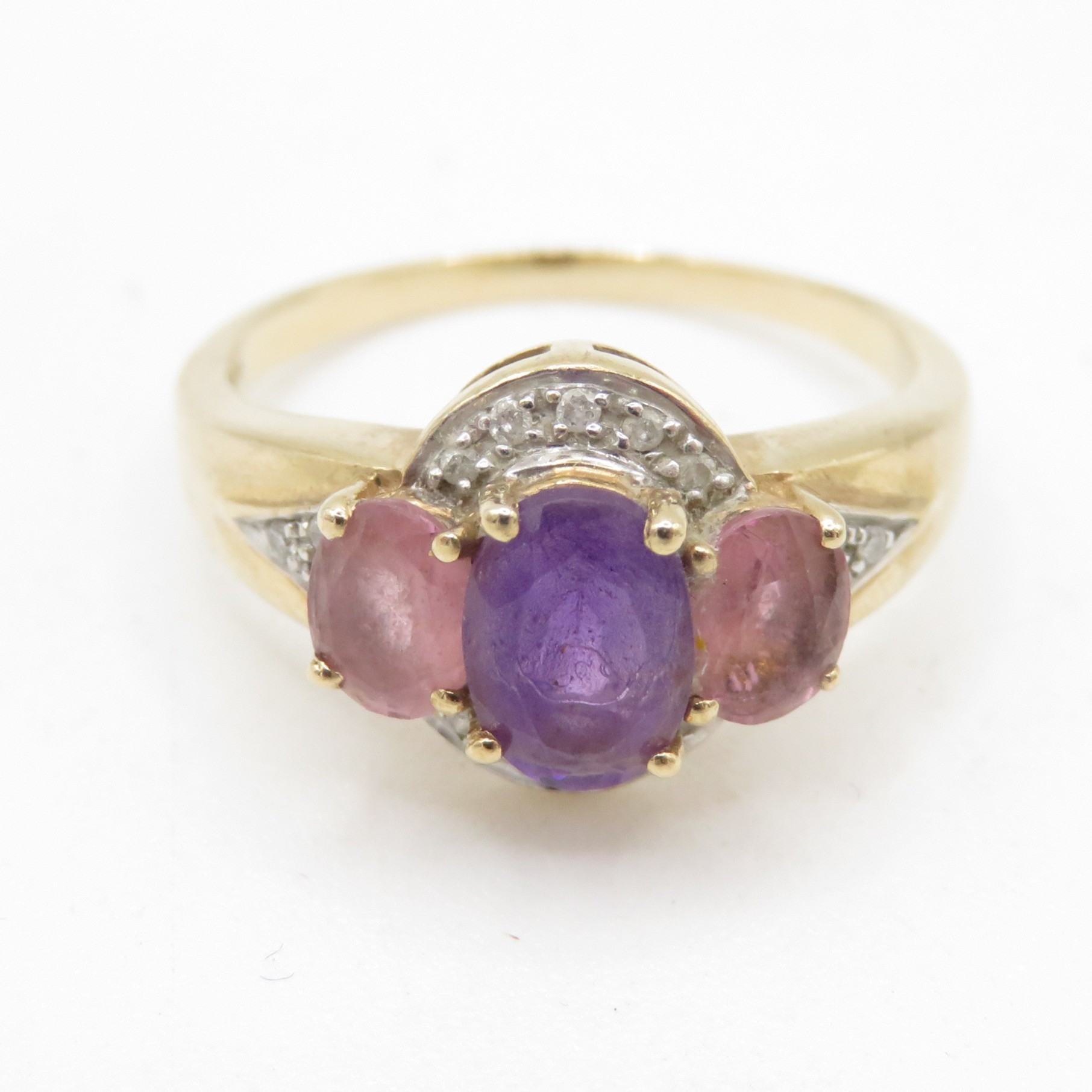 9ct gold diamond, amethyst & pink tourmaline dress ring (3.7g) Size O