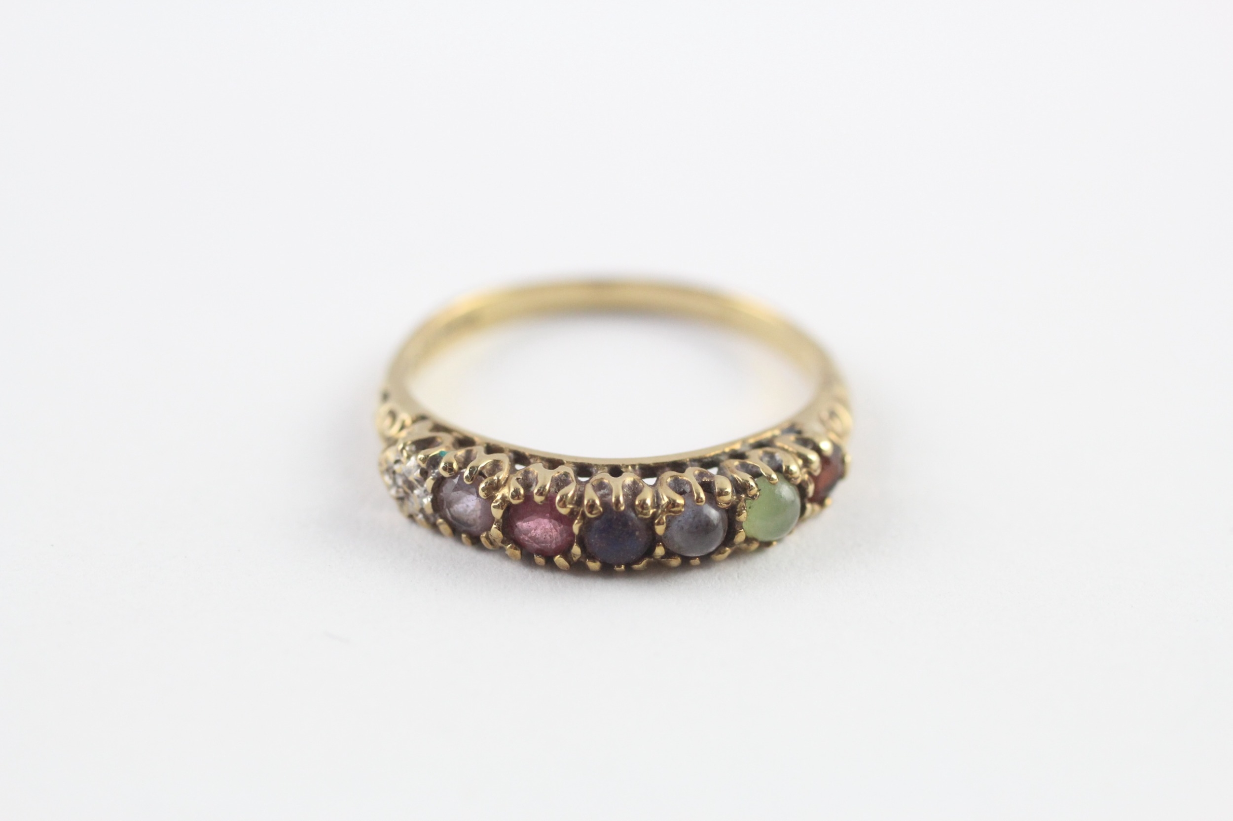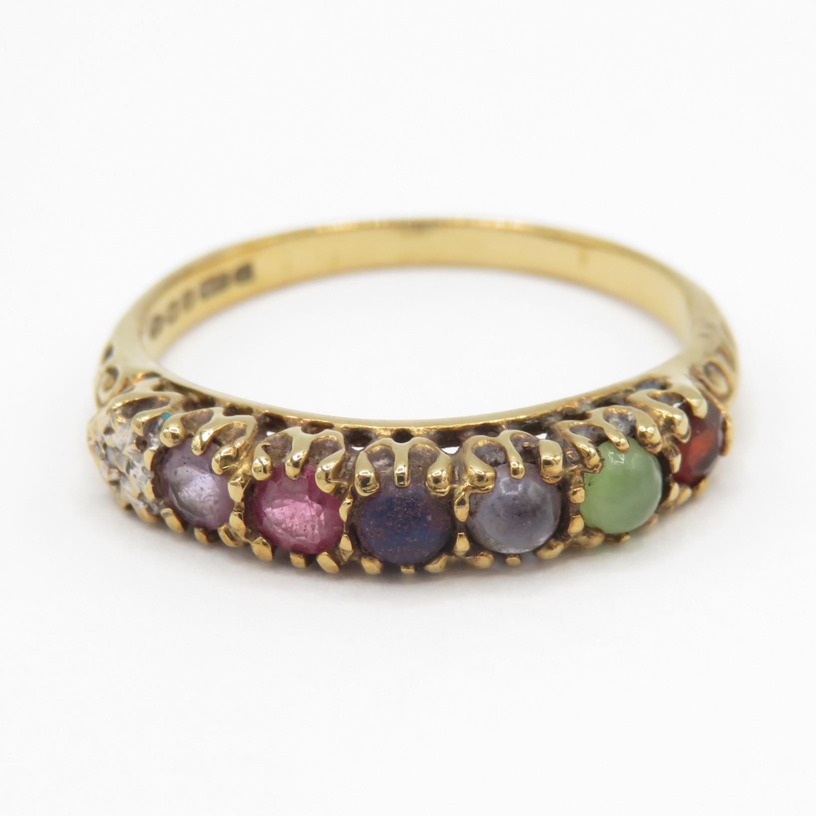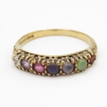 9ct gold darling ring set with diamond, amethyst, ruby, iolite, lapis, nephrite & garnet (1.5g) Size M
